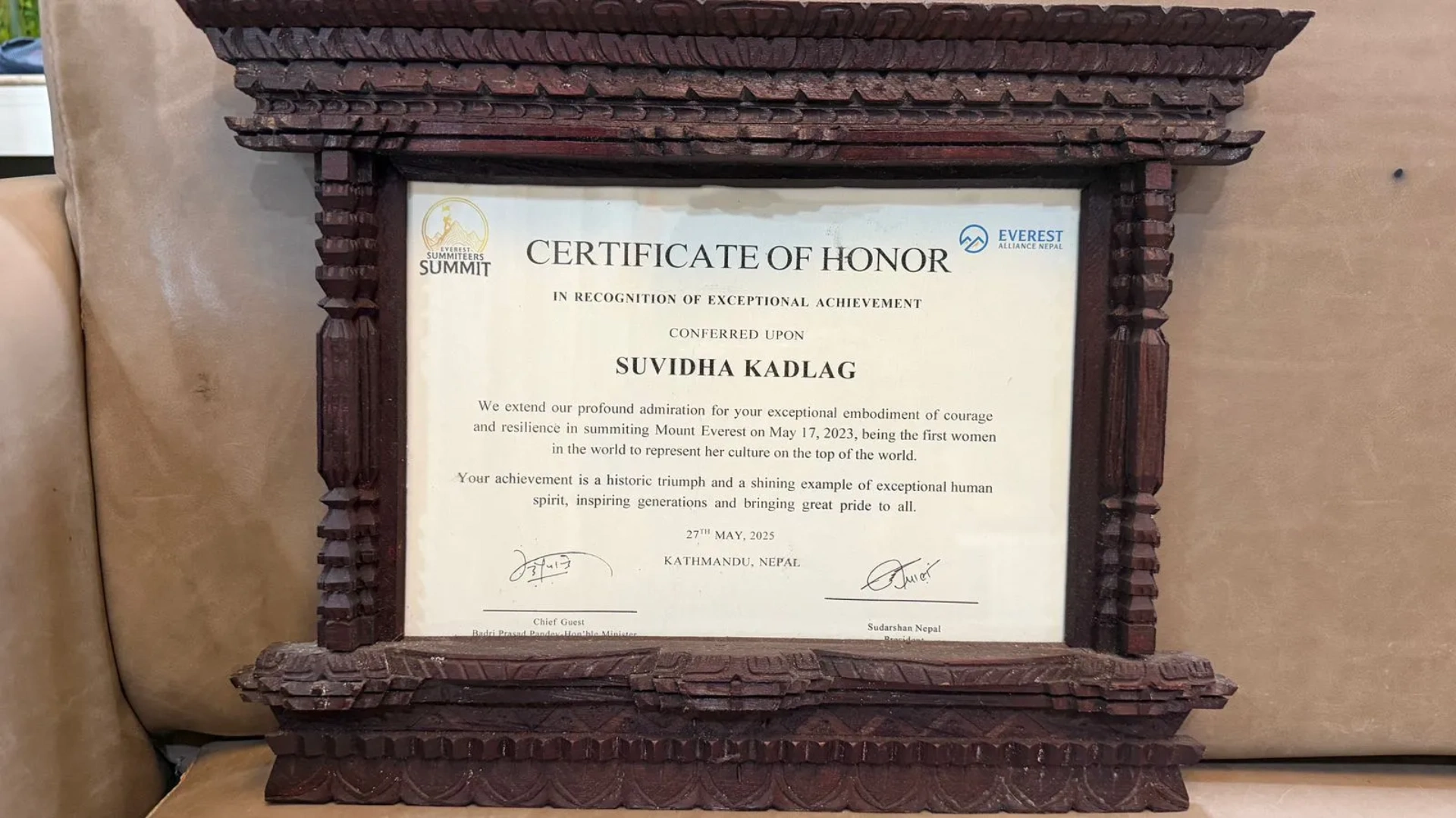 A mother of two, yet fearless, Suvidha Ji scaled Mount Everest in 2023 created History by taking Indian Culture to Everest Summit draped in a Nauwari saree, carrying the Indian Tricolor and proving that Indian women can summit the toughest peaks while rooted in tradition.